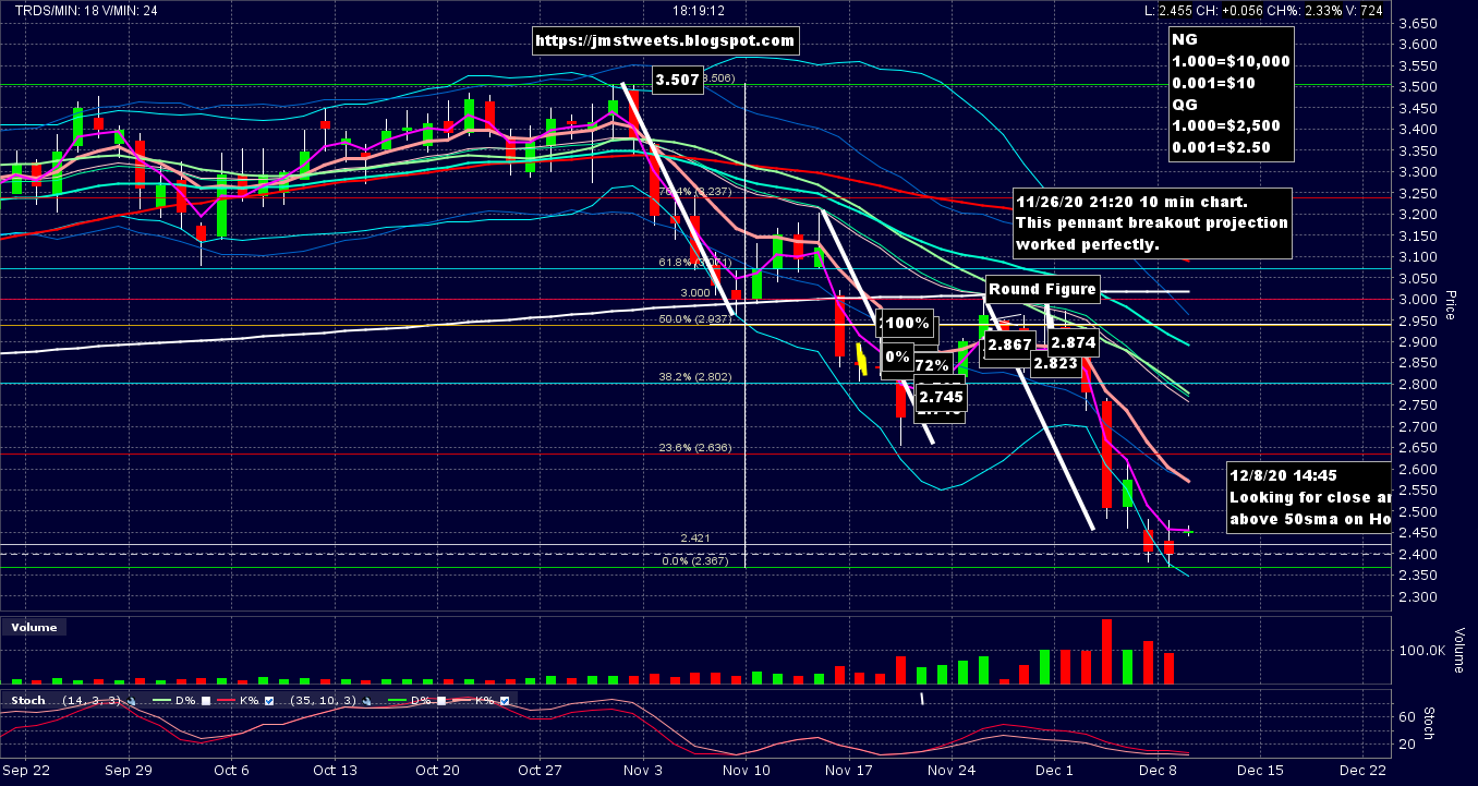 Now, on the Weekly, THO is not yet overbought nor has it closed below the 8ema. So the Bullish indications that got us into this trade have not yet been violated. If we were trading on the Weekly chart we should still be in the trade. However, we would have needed a much lower Stop and therefore a much smaller position in order to control the risk. And the setup looked so good, I didn't want to go in that light. Options would have been a good solution but the options on THO are terrible in terms of liquidity and Bid/Ask spread.